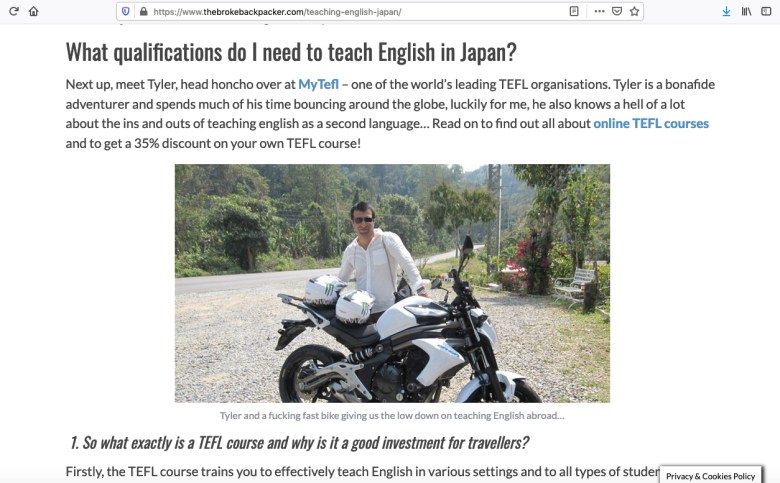 However, our attention was recently brought to the attention of a MyTEFL.com review on trustedteflreviews.com where the reviewer warned others not to trust the motivation behind MyTEFL’s affiliate “TEFL soldiers” out on the global field: https://trustedteflreviews.com/2019/12/28/dont-believe-the-mytefl-travel-blogs/