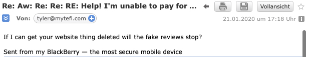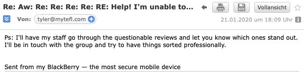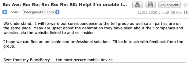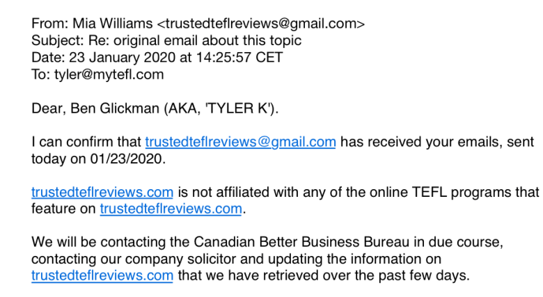 In the past few days, MyTEFL has openly written in an email that they will look into possibly deleting the defaming content if we can look into possibly deleting the reviews – thus adding blackmail into the equation too.