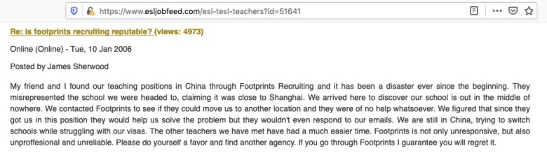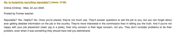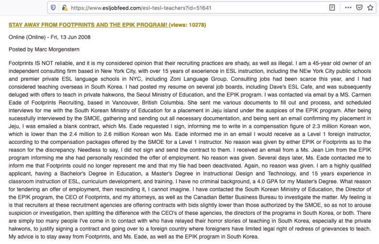 And so again, our hand has been forced and we are now proceeding with what our team’s research unearthed regarding MyTEFL.com and Footprints Recruiting – operating under different company aliases, but for all purposes the same company – headed by the same management.